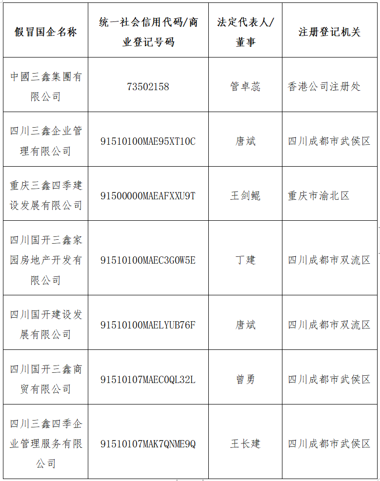 近期,经我司核实,发现中國三鑫集團有限公司系通过提供伪造文件及/或虚假信息等方式,注册登记为我司下属企业,中國三鑫集團有限公司及其在境内外投资的各级子企业(部分企业情况见下表)均为假冒国企,与我司及关联企业无任何隶属或股权关系,也不存在任何投资、合作、业务等关系,其一切行为均与我司无关。